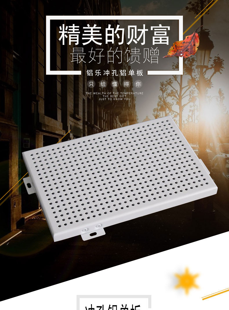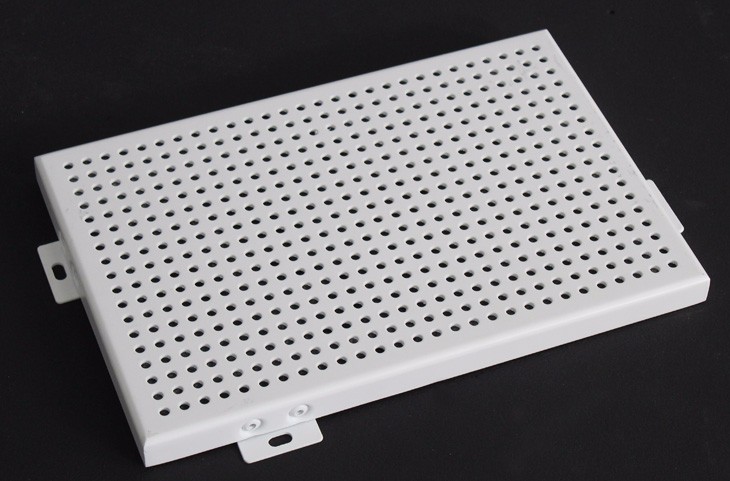 与常规铝单板相比,冲孔铝单板的特征就是表面形状各异的冲孔(包括圆孔、方孔、五角星、六边形孔等),装饰效果突出,也能够在一定程度上起到降低噪音的作用。集装饰性与实用性于一体,冲孔铝单板在工程装饰中使用的越来越多。氟碳冲孔铝单板特点: